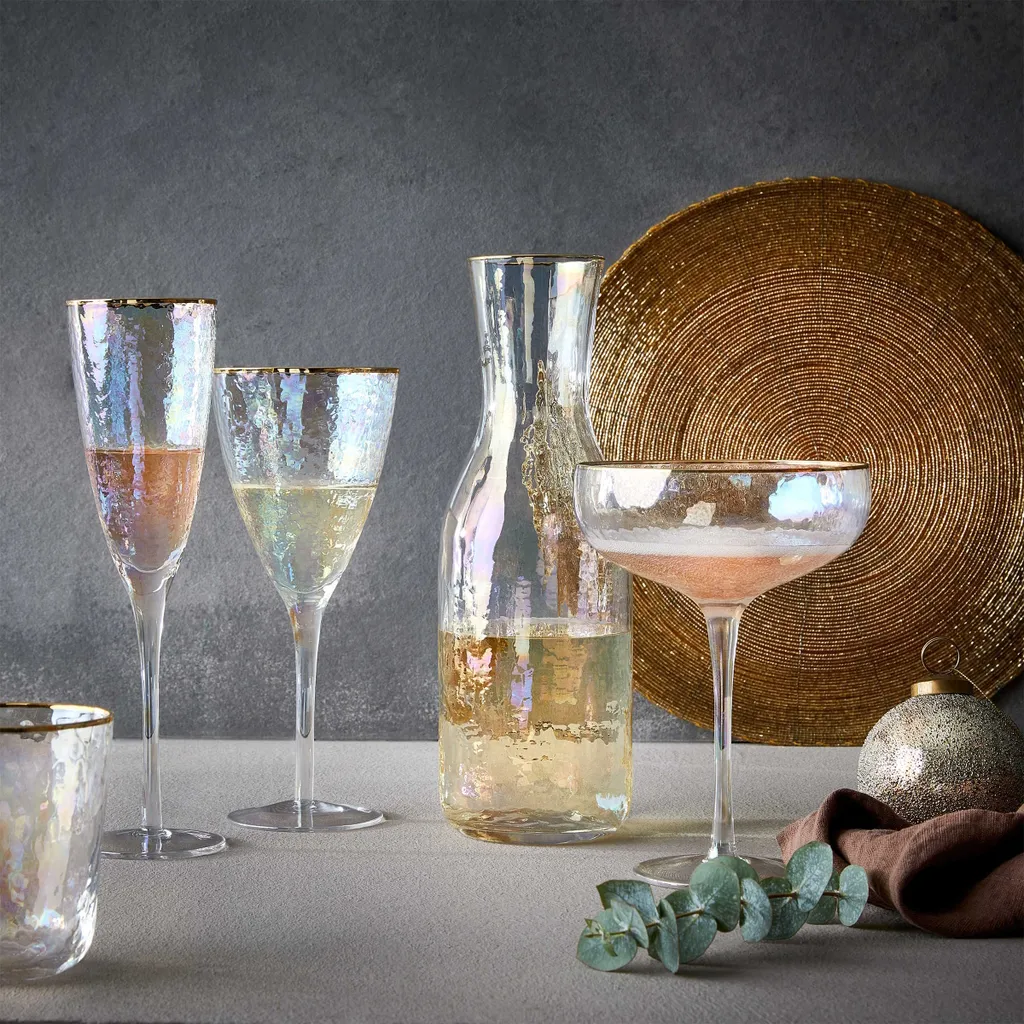 Wie die Perle einer Auster schillert auch das Smeralda Weinglas im 6er-Set mit Goldrand im zarten Perlmutt und weckt so echtes Fernweh nach Meer und Strand. Aber auch für den Urlaub zuhause ist das transparente Weinglas mit langem Stiel und leichter Oberflächenstruktur ein echter Hingucker. Kombiniert mit typischen maritimen Accessoires, wie Muscheln oder Deko-Fische und phantasievollem Geschirr holen Sie sich das Mittelmeer ganz einfach nach Hause. Zusammen mit den passenden Champagnerflöten und Wassergläsern ist der Strand-Look komplett.