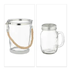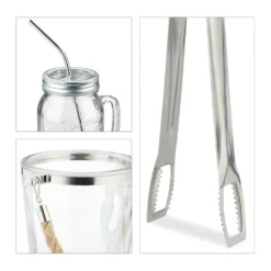 Servieren Sie auf der nächsten Sommerparty stilvoll Getränke mit dem Set aus Longdrinkgläsern und Eiskübel. Jedes der 4 Limonadengläser erinnert an ein Marmeladenglas und verfügt über einen kunstvoll gestalteten Schraubdeckel samt Strohhalm. Passend zur Kaltgetränk hält der Glaseimer Eiswürfel bereit, welche mithilfe der Zange einfach portioniert werden können. Das Erfrischungsensemble überzeugt mit charmanten Details wie der Gravur auf den Smoothie Gläsern und dem Seil als Henkel am Eiskübel.