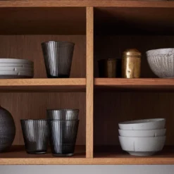 Mundgeblasene Gläser der Sie GRAND CRU MOUTHBLOWN für den täglichen Gebrauch, servieren eiskaltes erfrischendes Wasser in den eleganten rauchfarbenen Gläsern. Die sich wiederholenden Rillen zieren die Glasoberfläche und erzeugen bei Lichtbrechung ein raffiniertes optisches Spiel. Jedes Glas hat kleine einzigartige Variationen, da es mundgeblasen ist, ein elegantes Beispiel für funktionale, stapelbare Gläser für das moderne Leben.
